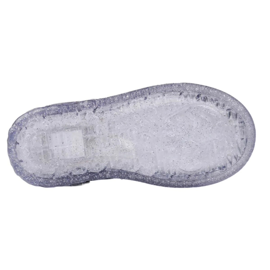 O grande destaque fica por conta do solado transparente texturizado com corações, repleto de glitter e luzes de LED brancas que iluminam cada passo com muito charme e diversão.