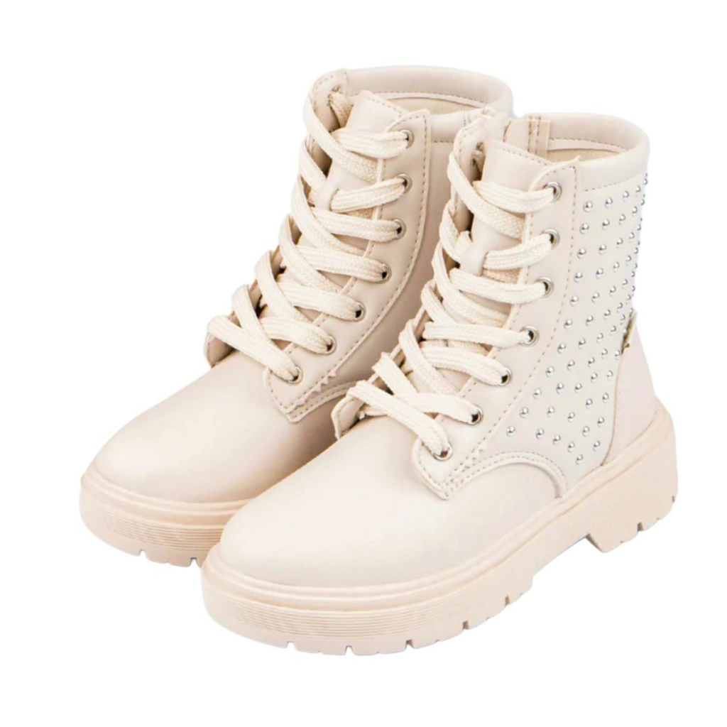 O fechamento lateral manual, aliado ao cadarço frontal, proporciona um ajuste prático e seguro. E para dar um toque especial, o modelo conta com esferas metálicas aplicadas em hotfix na lateral, adicionando um brilho sutil e elegante.