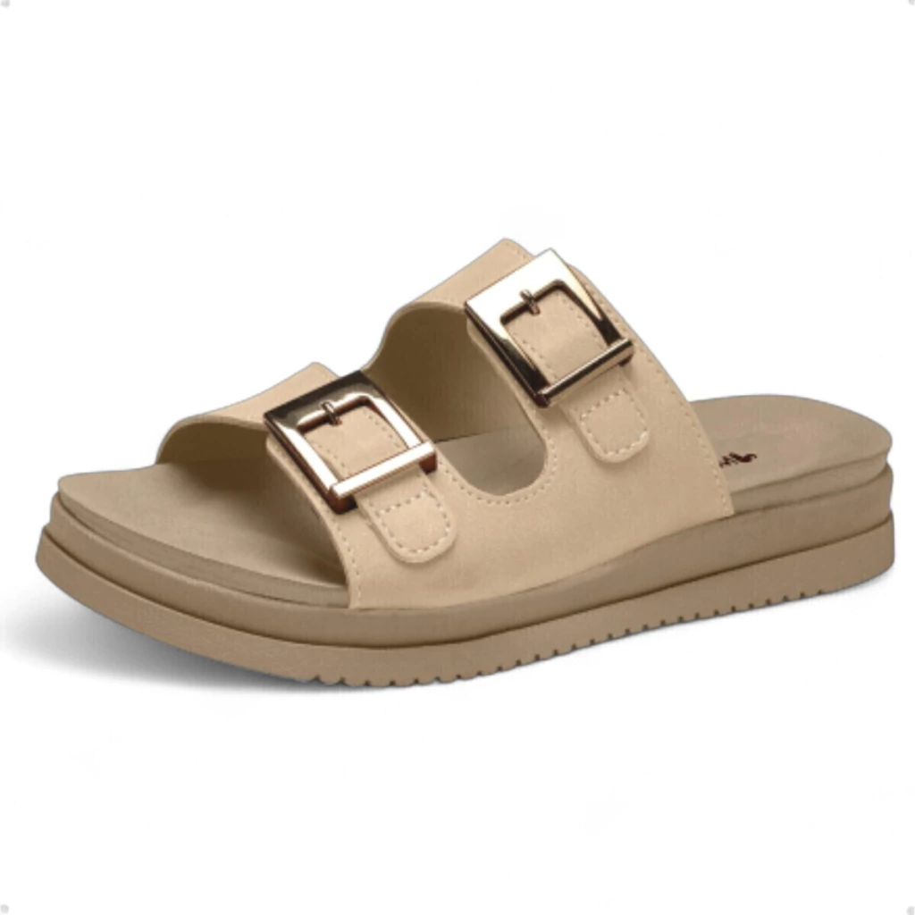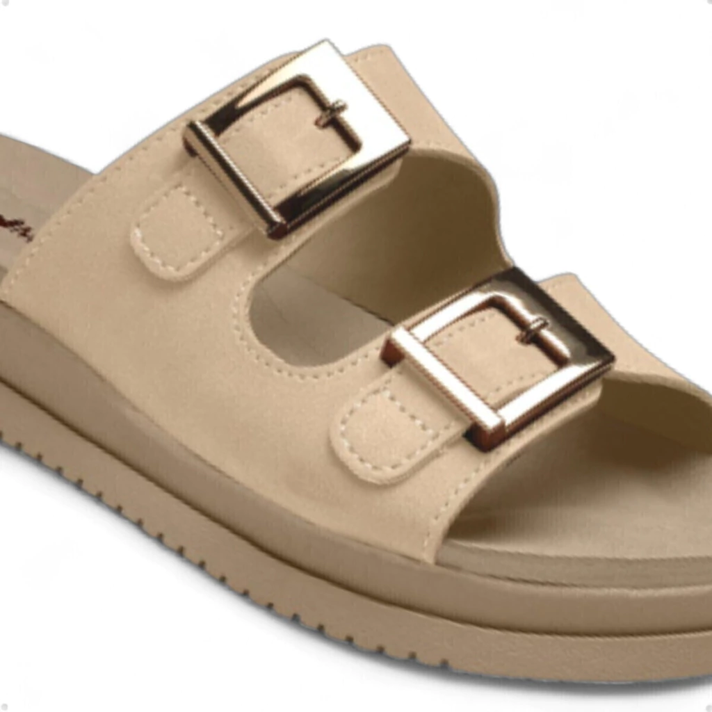- Design Sofisticado: Duas tiras largas na cor marrom com fivelas metalizadas, proporcionando um visual elegante e atual.