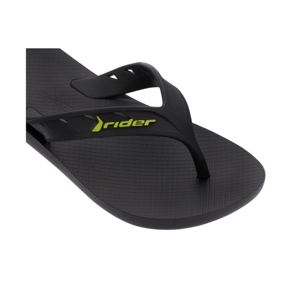 Aposte no conforto e estilo da Sandália Rider masculina. Com design moderno e totalmente preto, possui tiras em material resistente com o logo Rider em destaque na cor verde neon. A palmilha texturizada garante maior aderência aos pés, enquanto o solado leve e flexível oferece excelente conforto e segurança ao caminhar. Ideal para o uso diário, lazer ou praia.